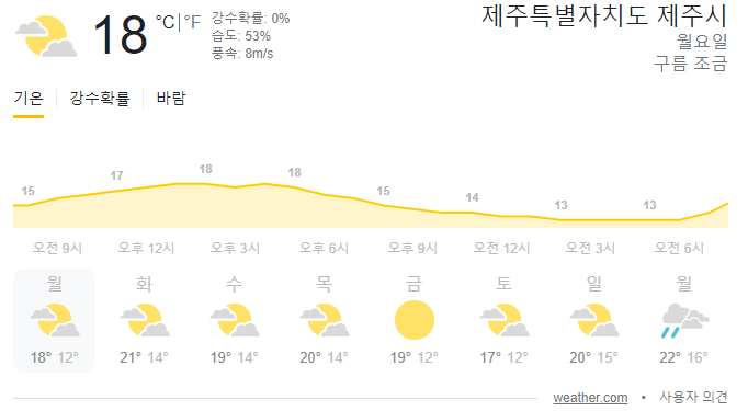 - 다만, 금주 수요일 내륙 전국적으로 비 예보가 있어 제주에도 영향을 받을 수 있다고 생각합니다.