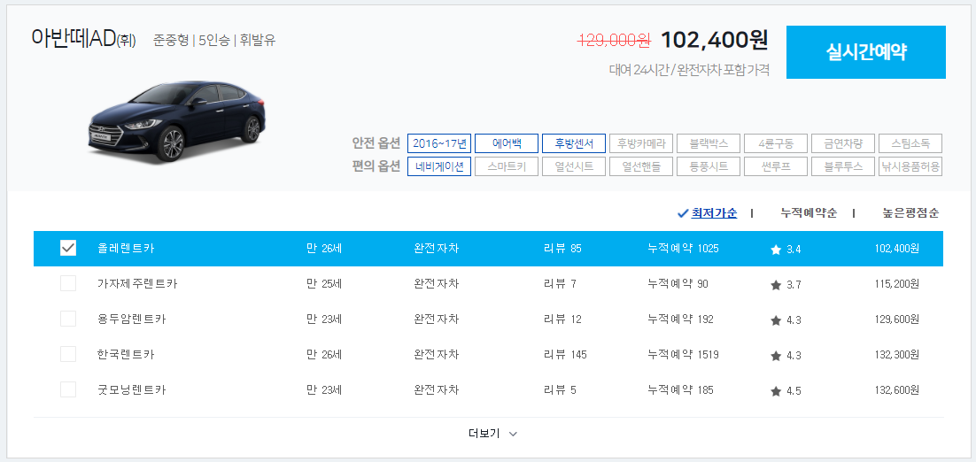 - 렌터카(24시간, 준중형 기준) 비용은 평일은 약 7만원, 금요일부터는 10만원 대의 금액대를 보이고 있습니다.