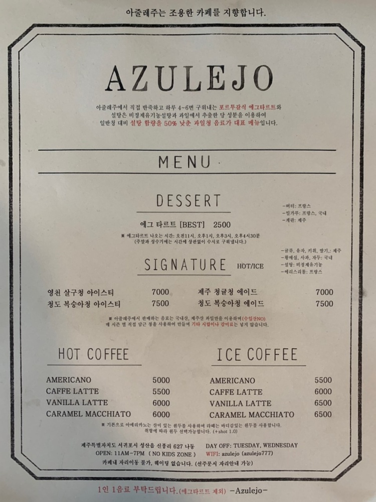 - 카페명(위치): 아줄레주(제주도 서귀포시 성산읍 신풍리 627 나동)