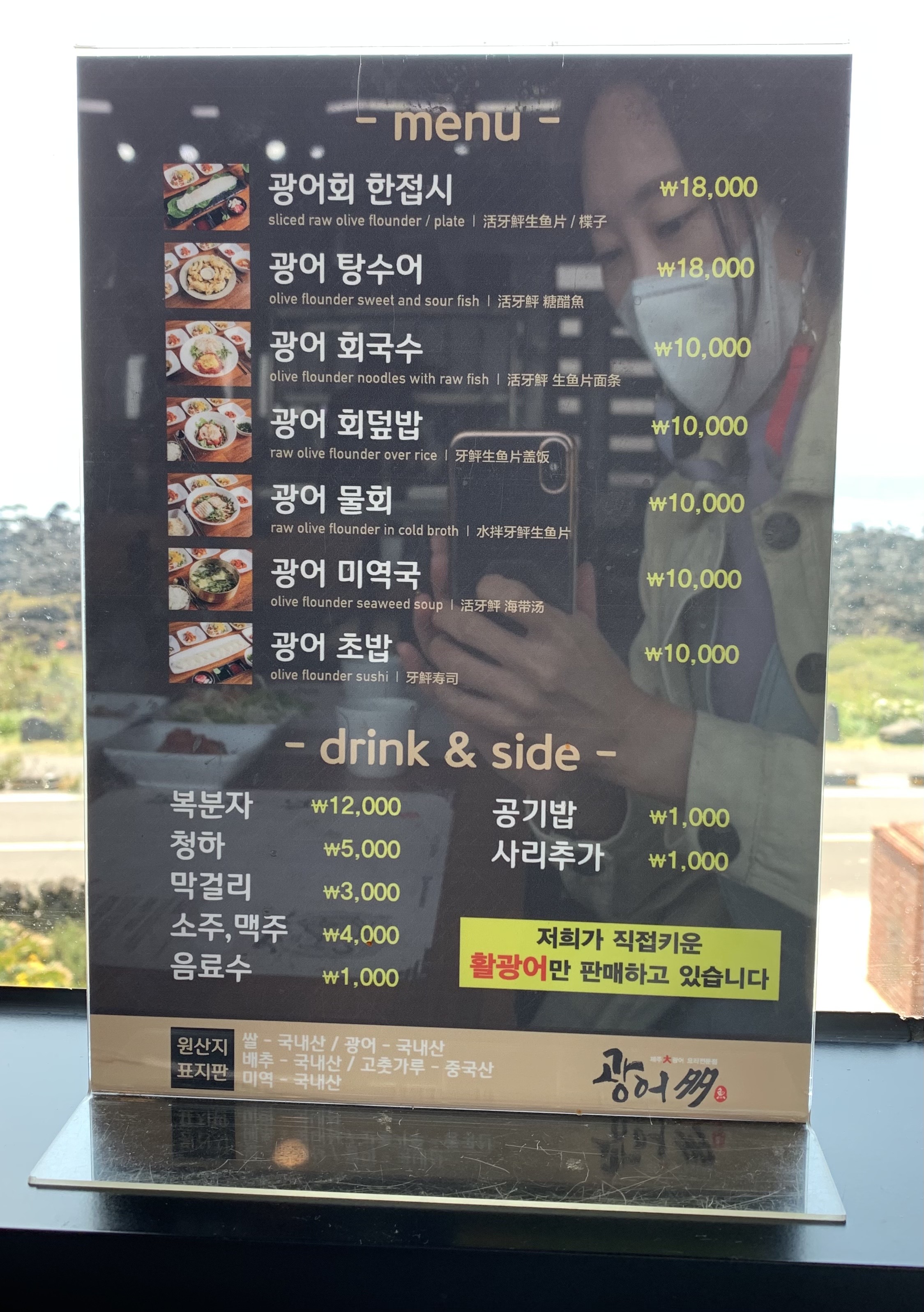 - 카페명(위치): 광어다(제주 서귀포시 표선면 민속해안로 73)