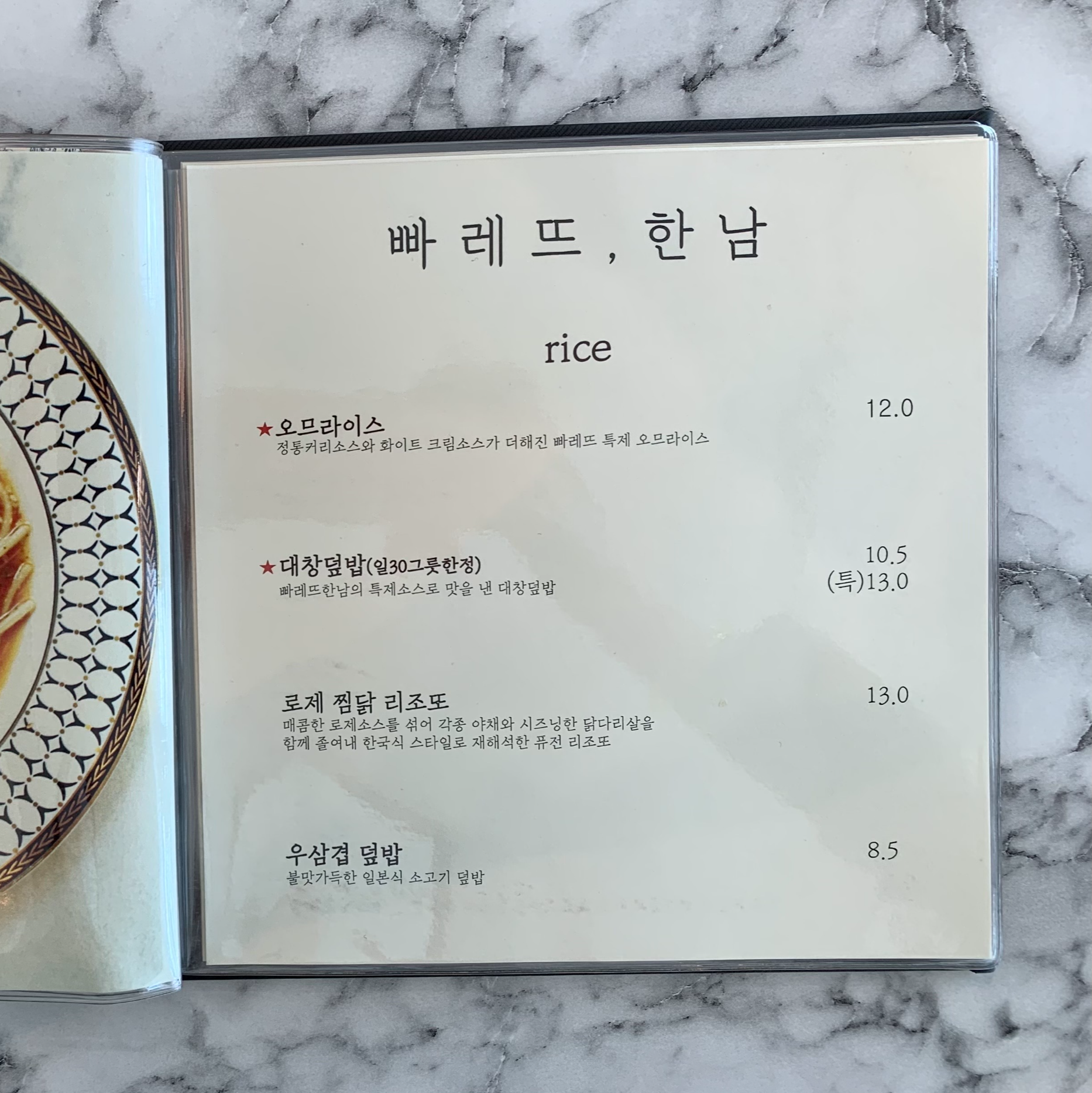 저희는 세트 메뉴인 빠레뜨 파스타+오므라이스+미니 우삼겹 샐러드 세트와 대창덮밥(특)을 추가해서 주문했어요. 가격은 세트 메뉴 3만 원, 대창덮밥 특 사이즈 1만 3천 원이었습니다.