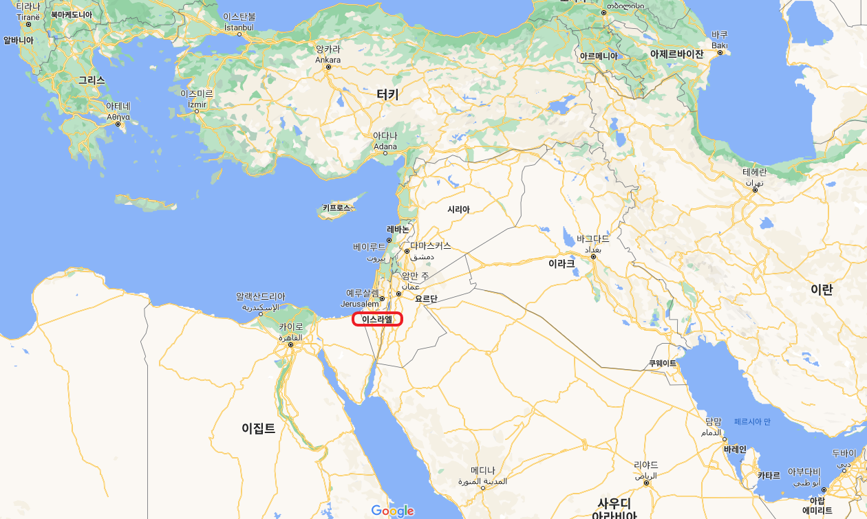현재 세계 지도상에 보여지는 이스라엘의 지도를 보면 서쪽으로는 이집트, 북쪽으로는 터키, 오른쪽으로는 요르단과 사우디가 위치하고 있습니다.