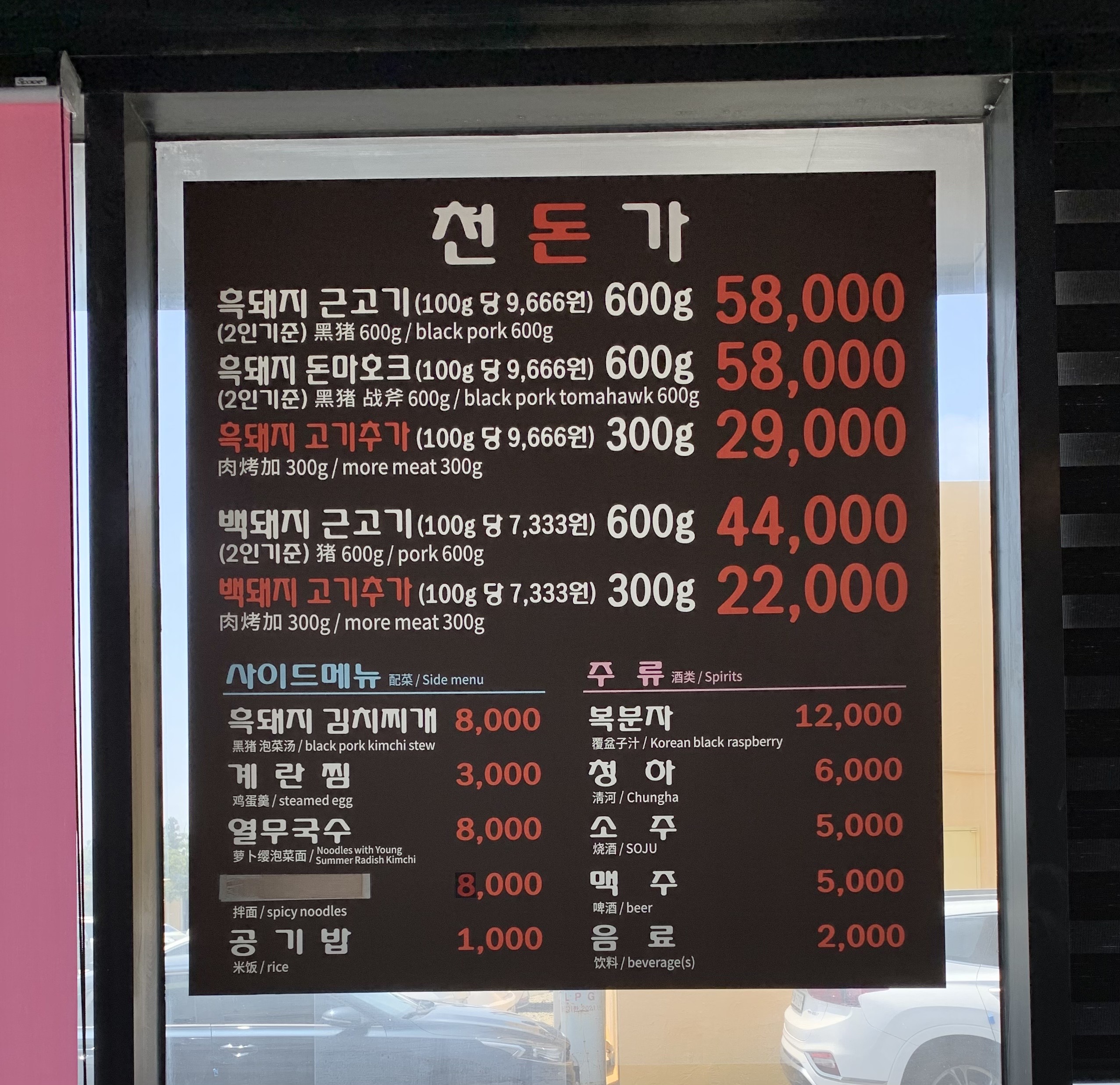 고기 가격도 이 정도면 보통 수준이네요! 제가 원래 제주도에서 가장 맛있는 흑돼지 고기집이 어디냐고 묻는다면 저는 "그 때 그집"이라고 이야기를 했었는데요. 이제는 천돈가로 바꿔야 할 것 같습니다! ㅎ