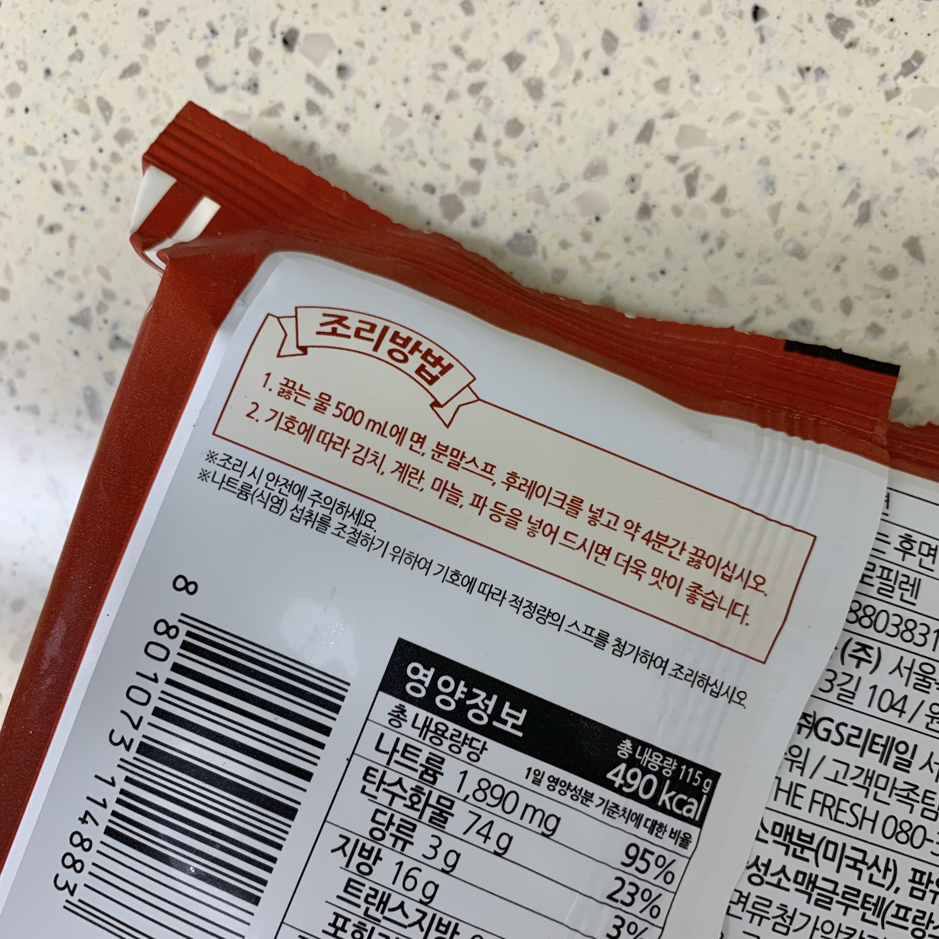 조리방법은 끓는 물 500mL에 면과, 분말스프, 건더기 스프를 넣고 약 4분간 더 끓이라고 나와있네요.