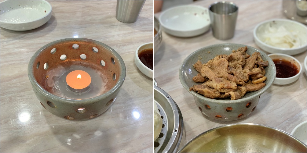 먹는 도중에 식지말라고 위 사진처럼 도자기 그릇 안에 촛불화로를 놓아서 따뜻함이 유지되도록 플레이팅 해주십니다.