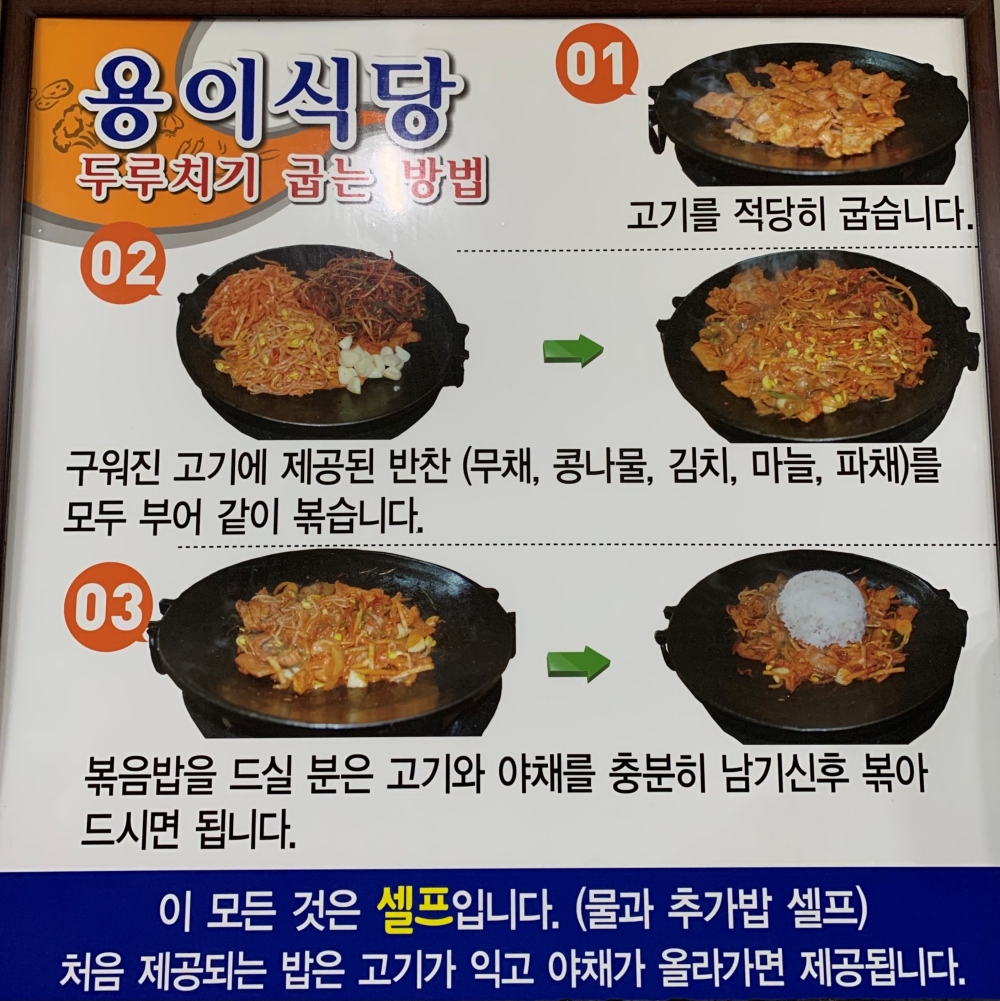 그리고 식당 내부 곳곳에 위의 사진처럼 두루치기 굽는 방법 안내판이 붙어 있었습니다. 그런데 여기서 눈에 띄는 것이 바로 모든 것은 셀프라네요! 정말 모든 것이 셀프였습니다. 처음에 자리에 앉으면 서빙하시는 분들이 알아서 인원수에 맞게 바로 플레이팅 해주시고 그 이후부터는 모든 것이 셀프였습니다.