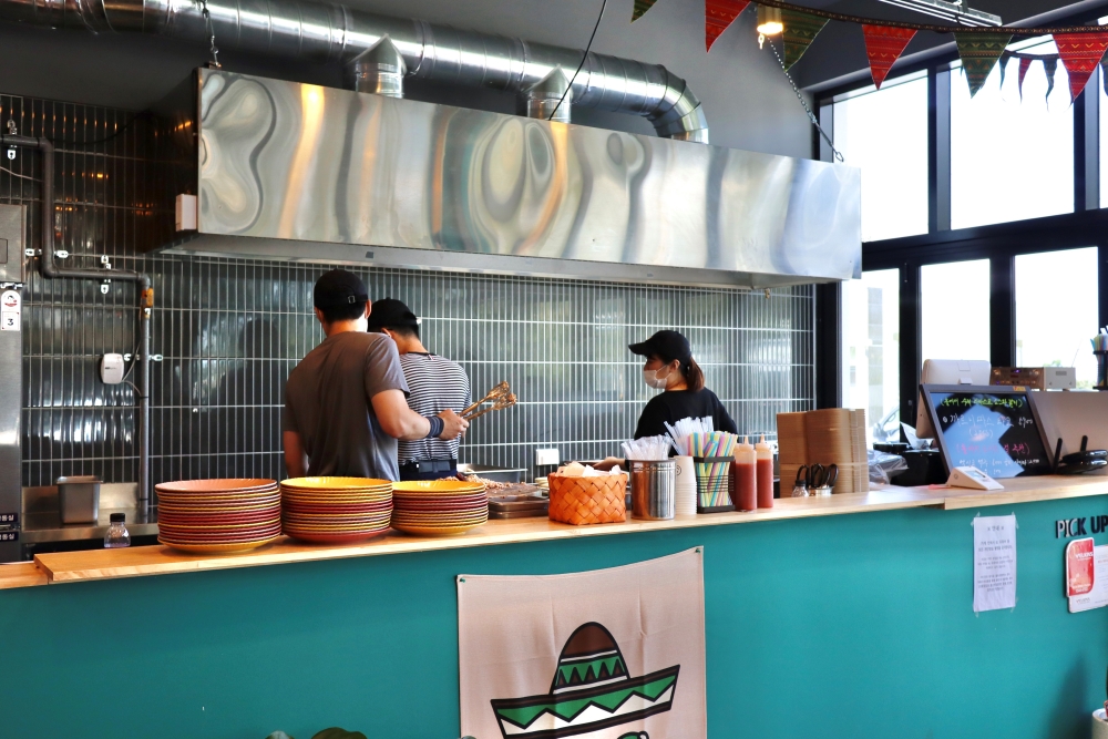 가게 내부는 오픈한 지 얼마 되지 않아서 확실히 청결했습니다. 그리고 의외로 테이블 개수도 있었습니다. 홀에서 타코를 주문해서 드시는 분들도 꽤 많이 있었으며 오픈형인 주방에서는 계속해서 쉬지 않고 타코를 조리하는 모습을 볼 수 있었습니다.