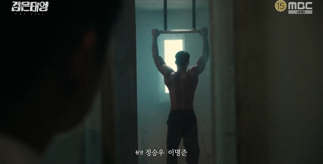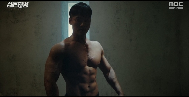 검은태양 7회의 시작은 격리시설(정신병원 같은 곳으로 보임)에 들어간 한지혁이 몸을 만드는 장면부터 시작한다. 아마도 6회 마지막에 강영필 국장의 책략으로 한지혁을 잡았고 별도 시설에 감금시킨 것으로 보인다.