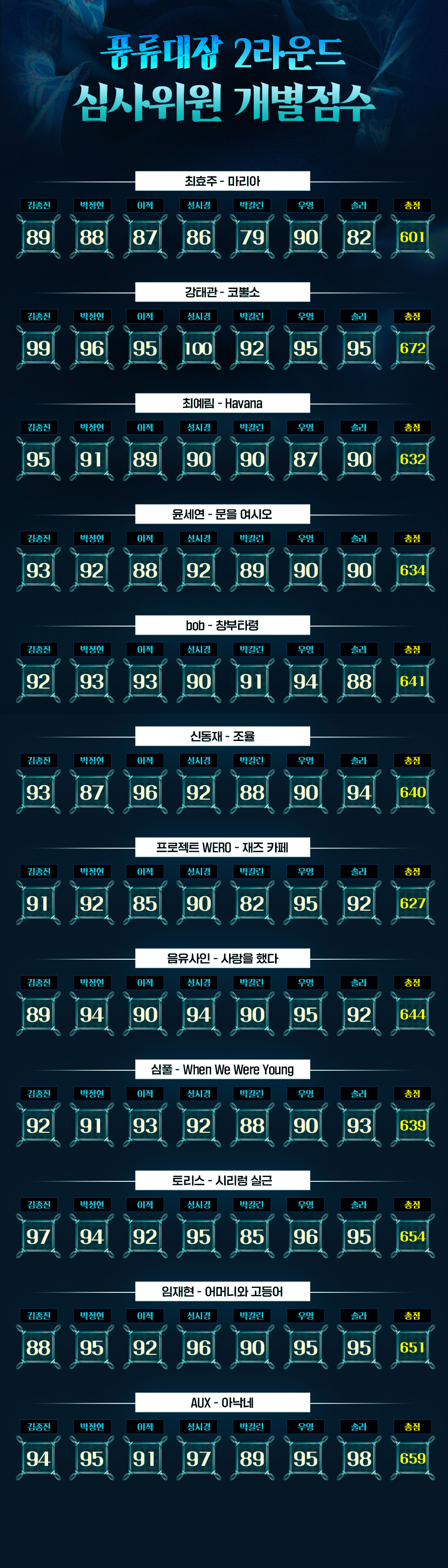 그리고 풍류대장 공식 홈페이지에서 저번 주 경연에 나왔던 참가자들의 심사위원 평가결과가 공개되었습니다.
