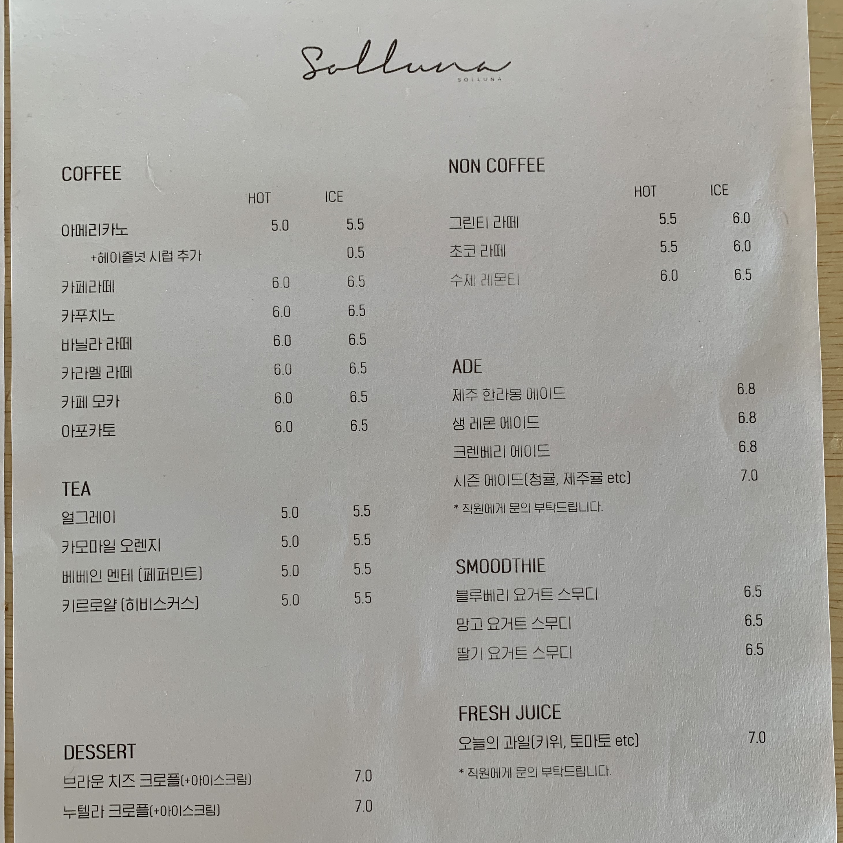 솔루나에서 판매하는 음료 메뉴는 위처럼 상당히 다양합니다. 가격은 살짝 비싼 편입니다. 그리고 카페 바로 앞에 펼쳐지는 바다 뷰와 범섬은 정말 아름답기 때문에 어느정도 가격이 인정됩니다.