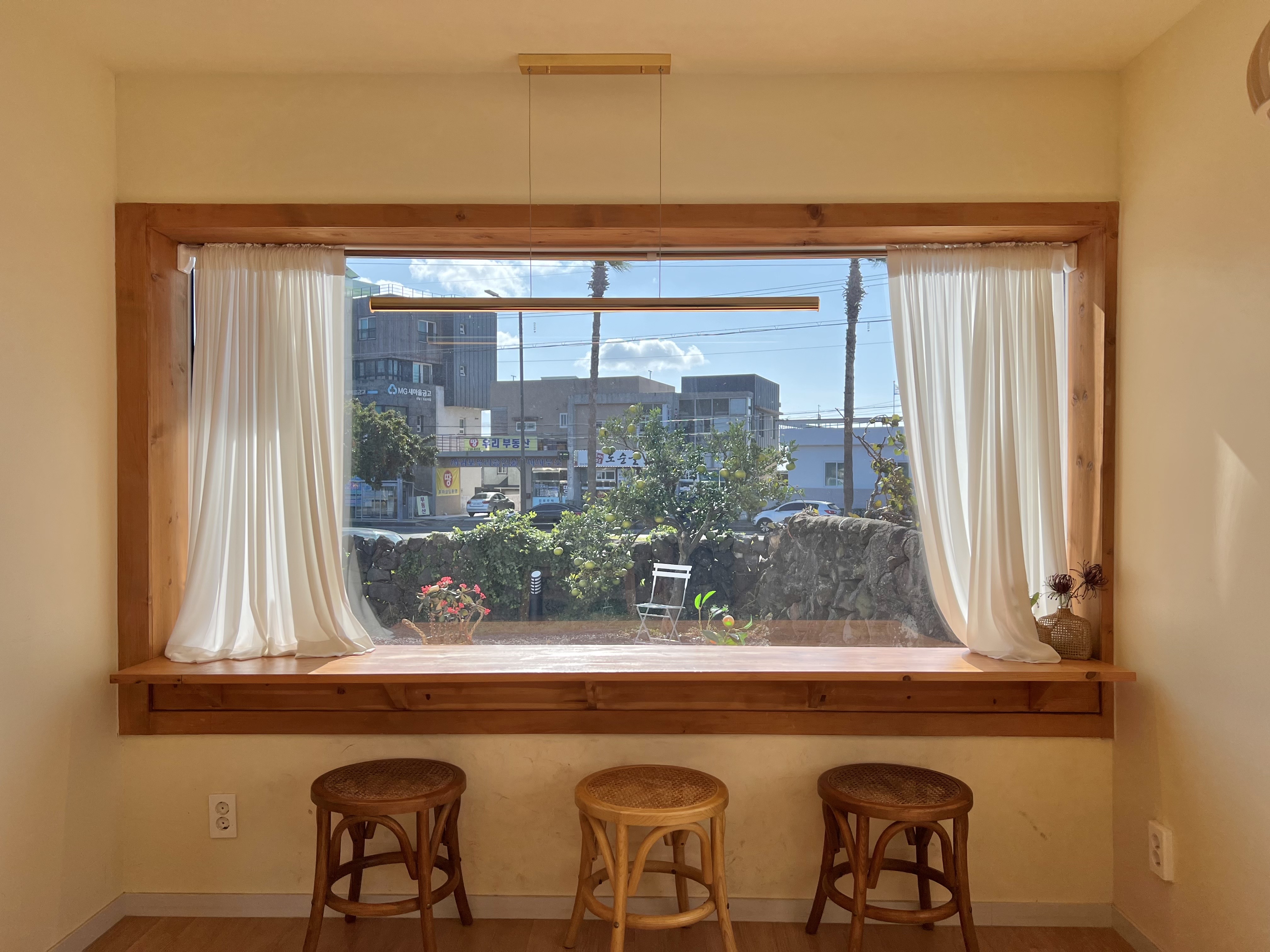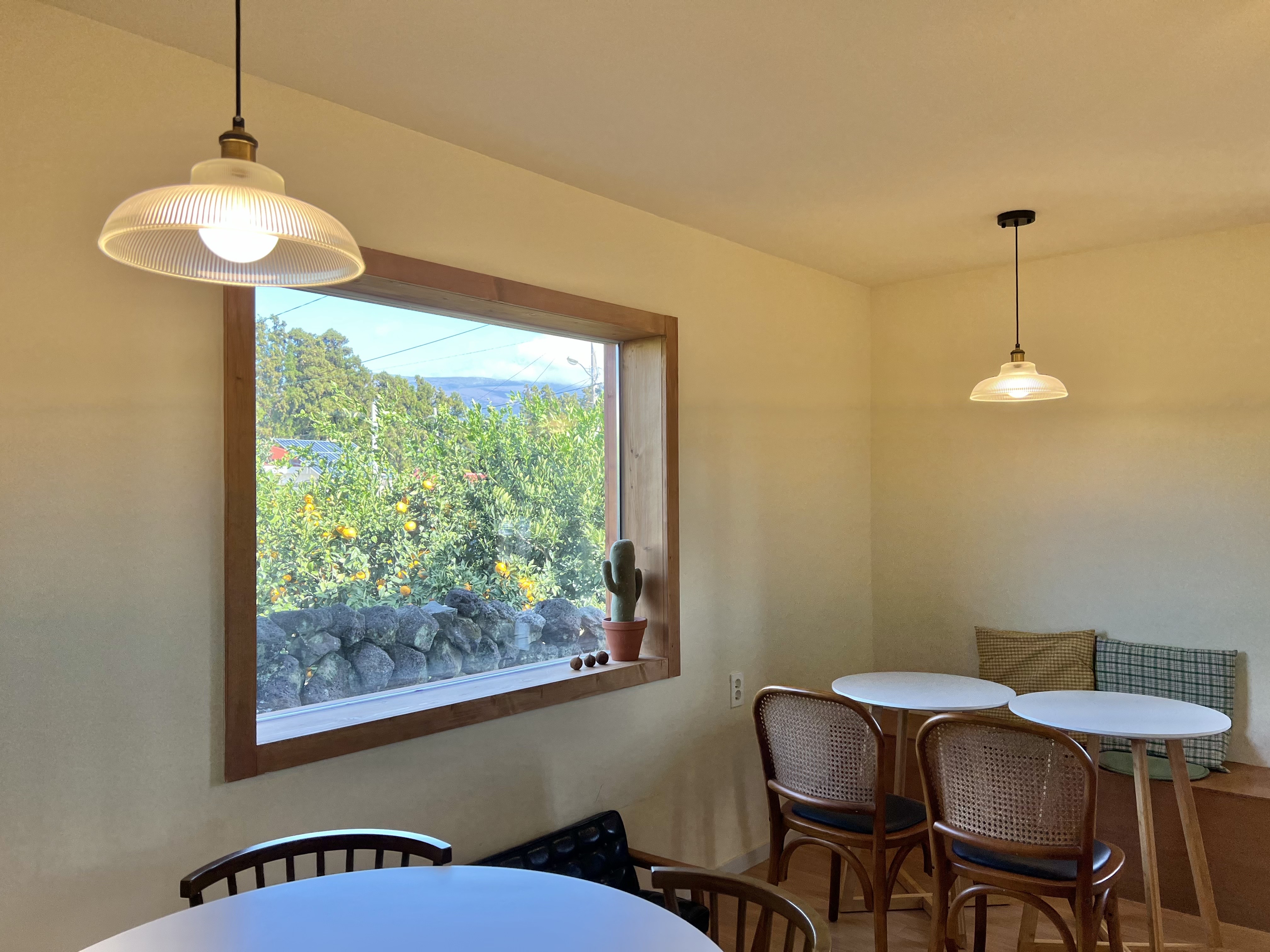 그리고 카페 아띠의 시그니처 포토존이죠. 귤밭이 뒷마당이 보이는 통창 앞에 앉아있으면 정말 사진 찍기 좋습니다.