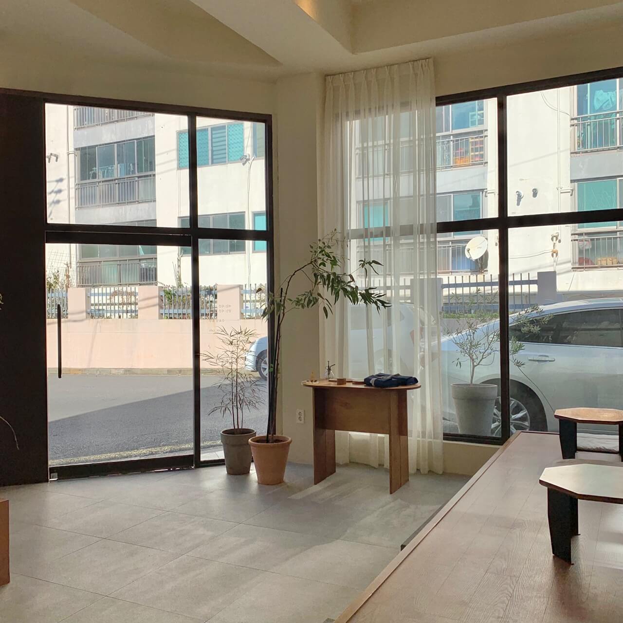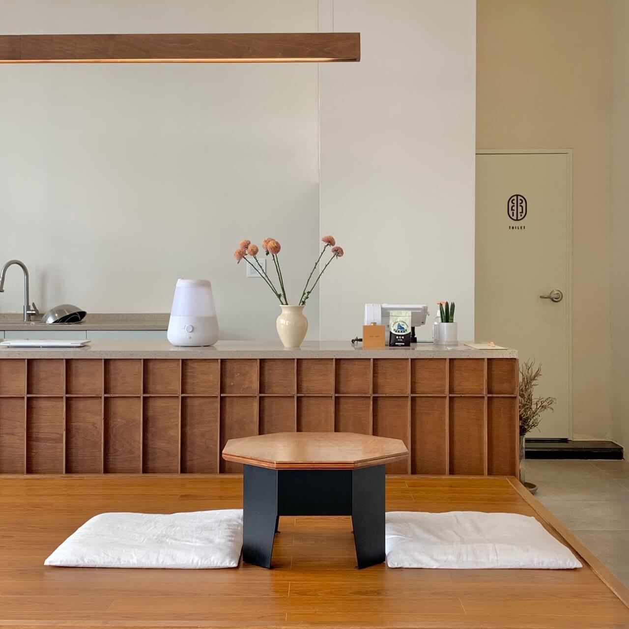 하지만 카페 내부로 들어가면!! 화이트&우드 인테리어로 아주 깔끔하면서 분위기 있어 맘이 편안해지는 기분입니다. 좌식 테이블 3개와 입식 테이블 2개로 테이블은 많지 않지만 내부 공간이 꽤 넓고 테이블 간격이 넓어 쾌적했습니다.