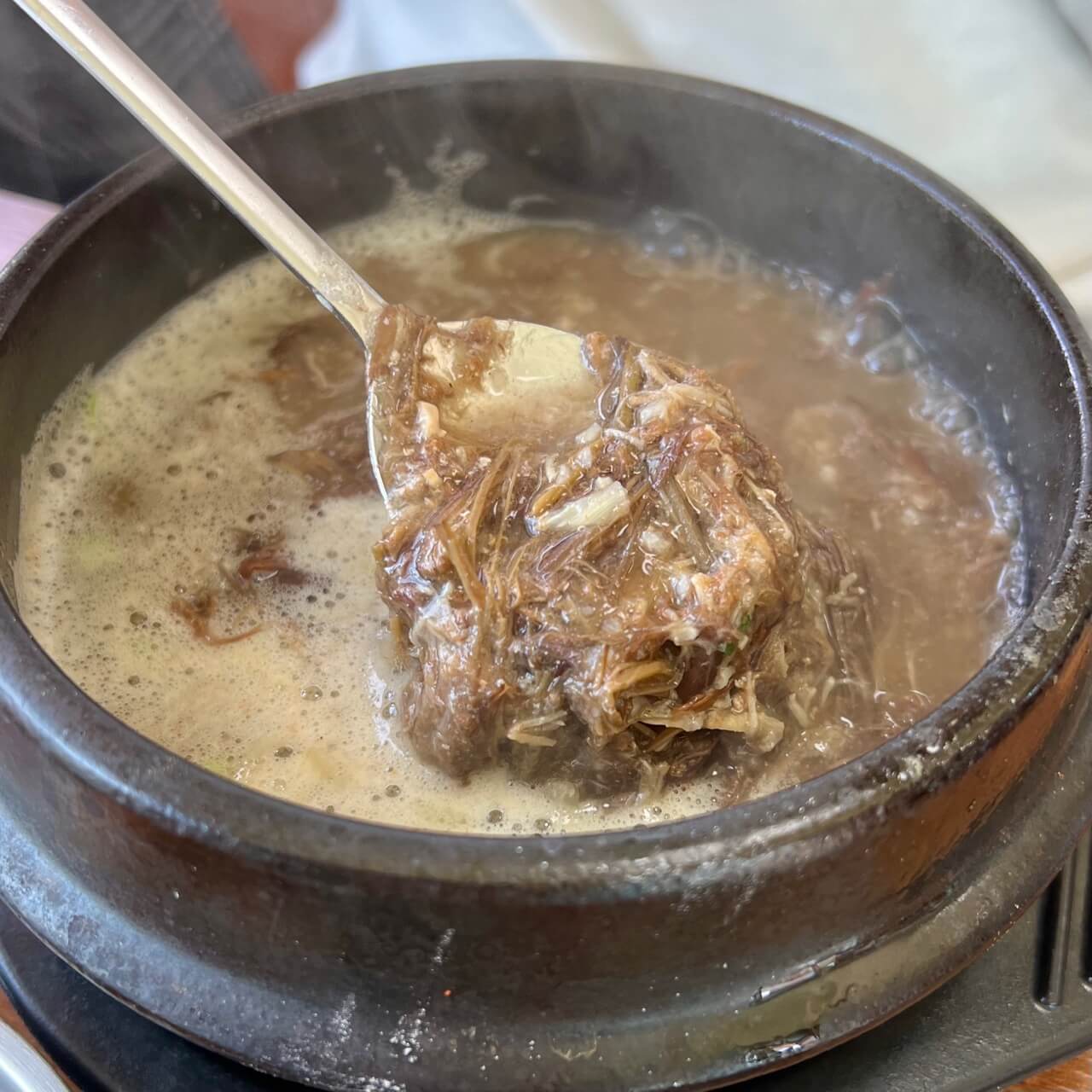 육지에서 먹는 육개장과 달리 제주도 향토음식, 고사리육개장은 고사리를 잘게 찢어 넣어 식감이 마치 고기를 씹는 듯한 느낌입니다. 진짜 신기해요! 거기에 메밀가루까지 넣어 걸쭉하면서 고소한 맛이 일품입니다.