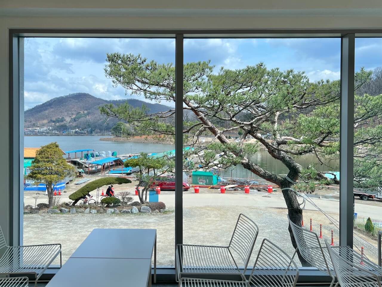 주문 후 2층으로 올라가면 3면이 통창이라 1층보다 시흥 물왕저수지 뷰가 더 잘 보입니다! 뷰 맛집이에요. 특히 한쪽 창문 전체가 폴딩 도어였는데 날이 좋아 폴딩 도어를 다 열어놔서 바람이 솔솔 불어와 시원하고 개방감이 좋았습니다.