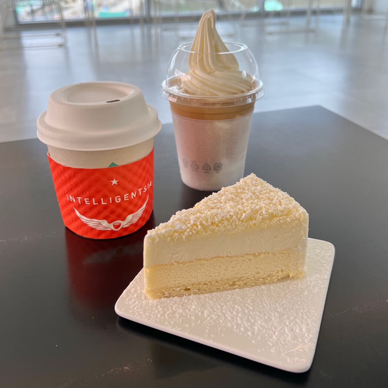 어느 곳에 앉아도 명당 자리였고 저희는 강아지와 편하게 있기 위해서 소파 자리에 앉았어요. 잠시 뒤 주문한 메뉴가 나왔습니다. 소프트 아이스크림 라떼는 아이스크림이 가득 올라가 있어 달달하면서 부드러운 라떼였어요. 아메리카노는 무난한 맛이었고 케이크도 꾸덕해서 맛있게 잘 먹었습니다.