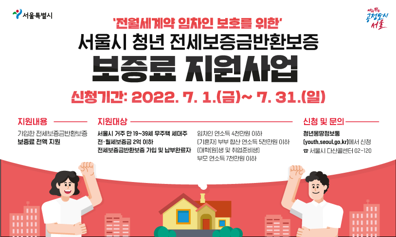 - 신청자격 : 만 19세~39세(1982.07.02~2003.07.31 출생), 서울시 거주 무주택 세대주(22.07.01 기준), 전월세보증금 2억 이하, 전세보증금반환보증 가입 및 납부완료자, 연소득 4천만 원 이하(기혼 : 부부합산 5천만 원, 대학(원)생 및 취업준비생 등 : 부모 7천만 원 이하)