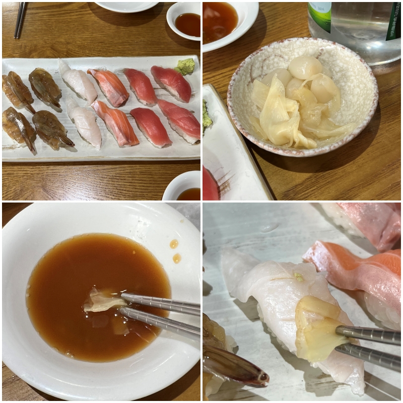 그러다 보니 초밥을 젖가락으로 들 때 초밥이 많이 무너지게 되는데요. 그래서 와사비장을 찍어먹지 않고 위 사진처럼 초생강을 활용하여 와사비장을 초밥에 바른 다음 조심히 초밥을 들어서 먹습니다.