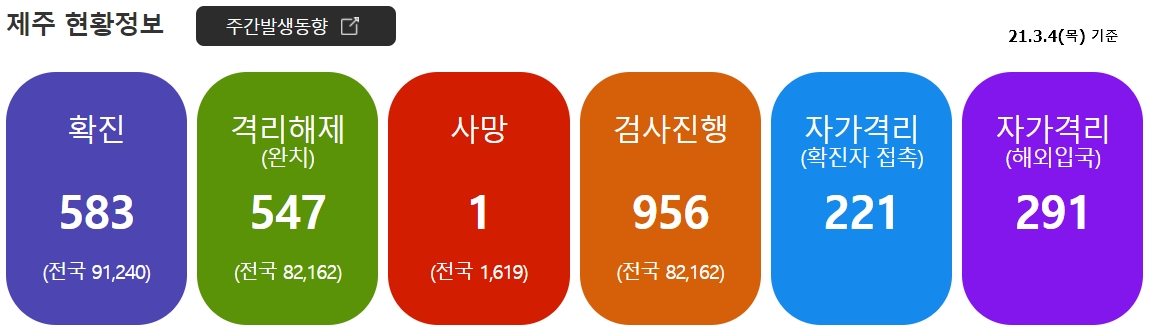- 3.2(화) 제주에서 4명 추가 확진자 발생, 3.3(수) 3명 추가 확진자 발행하였습니다.